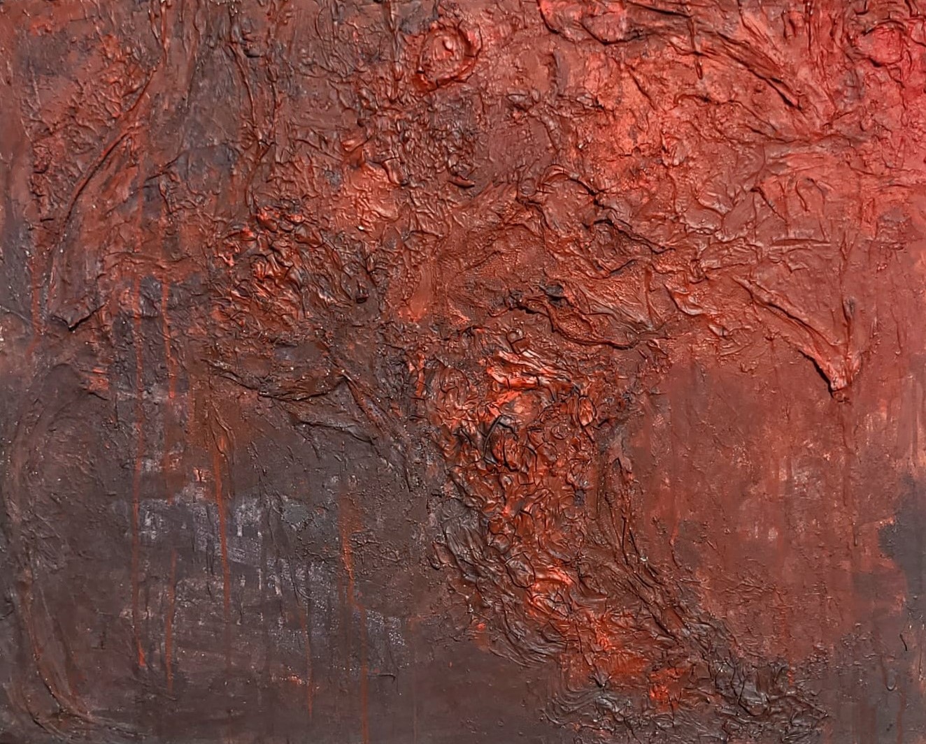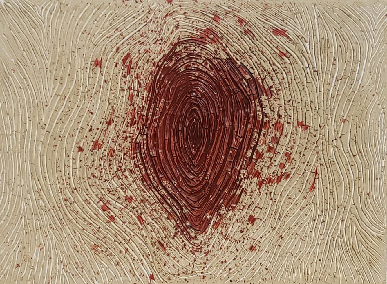 The works are abstract and layered, using texture, color, and unconventional materials such as chalk powder, sanitary napkin fibers, tampons, band-aids, and now crystals and stones. These elements carry their own weight—some raw and visceral, others decorative—mirroring how society both glamorizes and hides women's suffering.