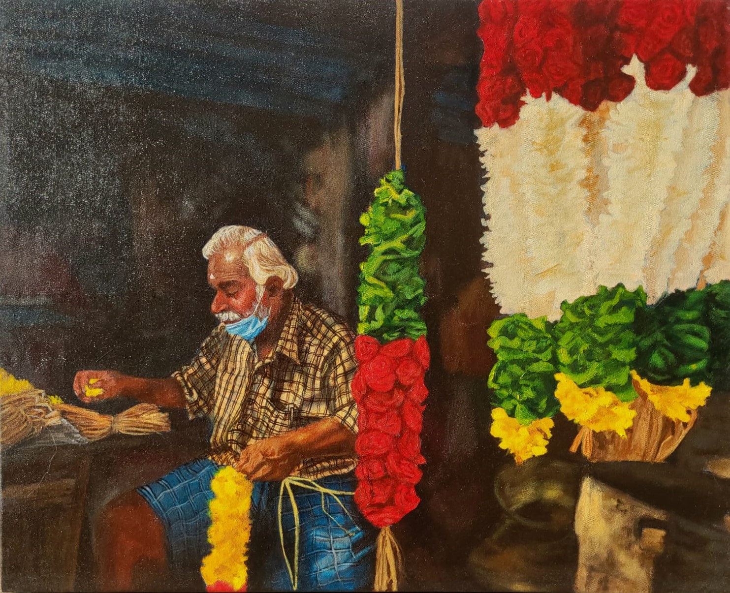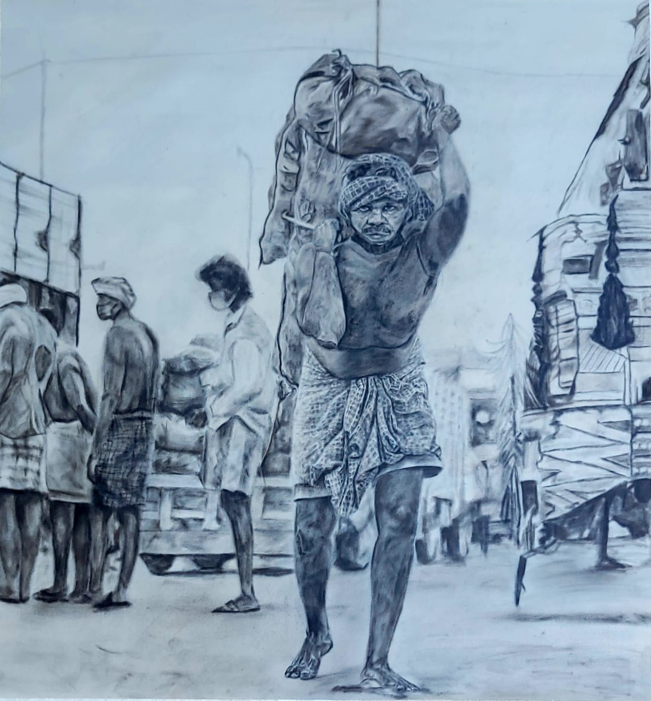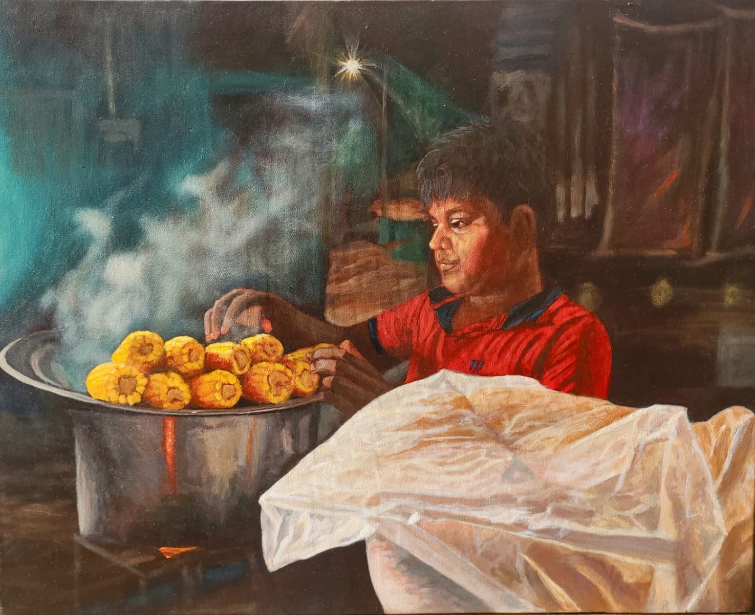 In this series, I have portrayed street vendors and roaming laborers—individuals who move through the margins of the city, selling goods or offering services to sustain themselves. These figures belong to the financially lower strata of society, yet they embody resilience, movement, and survival. The works depict a variety of age groups, reflecting the generational span of this often-overlooked community. Through these representations, I aim to capture both the dignity and hardship of their everyday lives.